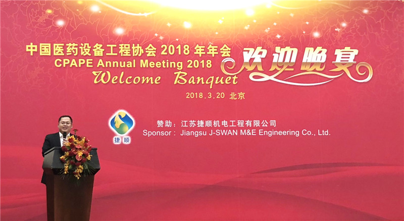 2018年3月20日,江蘇捷順公司參加了2018年中國醫(yī)藥設(shè)備工程協(xié)會年會。協(xié)會當(dāng)天晚上的歡迎晚宴由我司贊助舉行,并且捷順公司董事長陳泓宇先生也作了歡迎致辭。