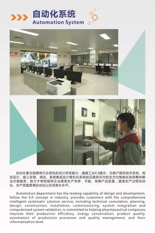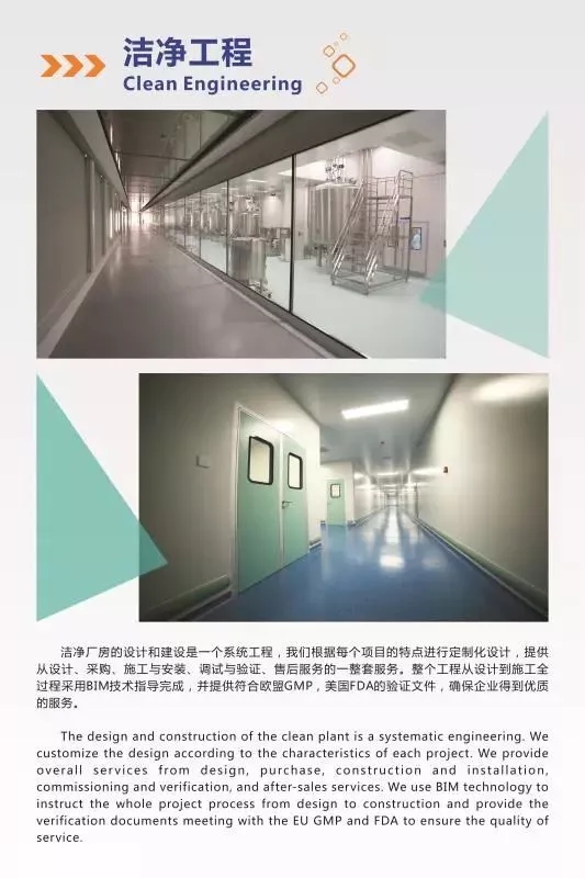 公司嚴(yán)格按照潔凈廠房設(shè)計(jì)、施工規(guī)范,中國(guó)GMP、cGMP、EuGMP等規(guī)范要求,為生物醫(yī)藥、食品飲料、電子、航空航天、科研教學(xué)、電力等行業(yè)提供潔凈廠房、空氣凈化、潔凈管道系統(tǒng)、自動(dòng)化控制系統(tǒng)工程的設(shè)計(jì)、三維建模、施工、調(diào)試、檢測(cè)驗(yàn)證及技術(shù)支持、人員培訓(xùn)服務(wù)等。